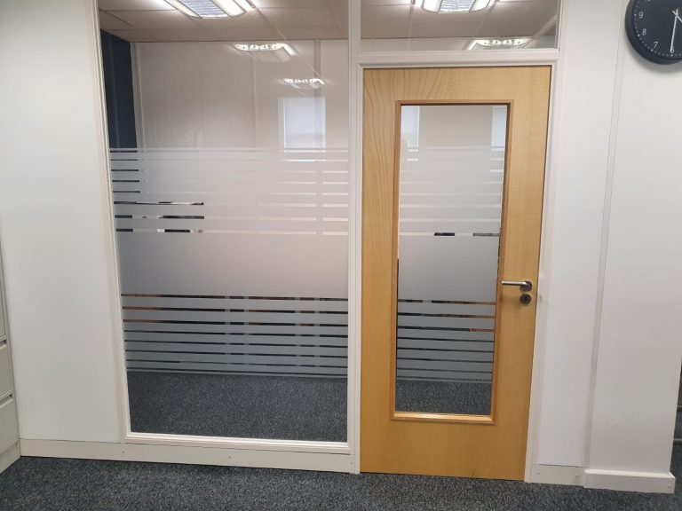 Etched vinyl gives the appearance of sandblasted glass at a fraction of the cost, offering a premium look that aligns well with corporate branding. Frosted vinyl can also be customised with patterns, logos, or bands, combining privacy with subtle visual interest